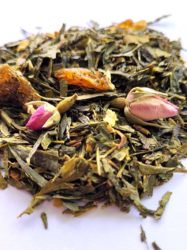 | Skład | Sencha, rodzynki, pąki róż, kwiat słonecznika i malwy, wyjątkowa kompozycja owocowych aromatów |