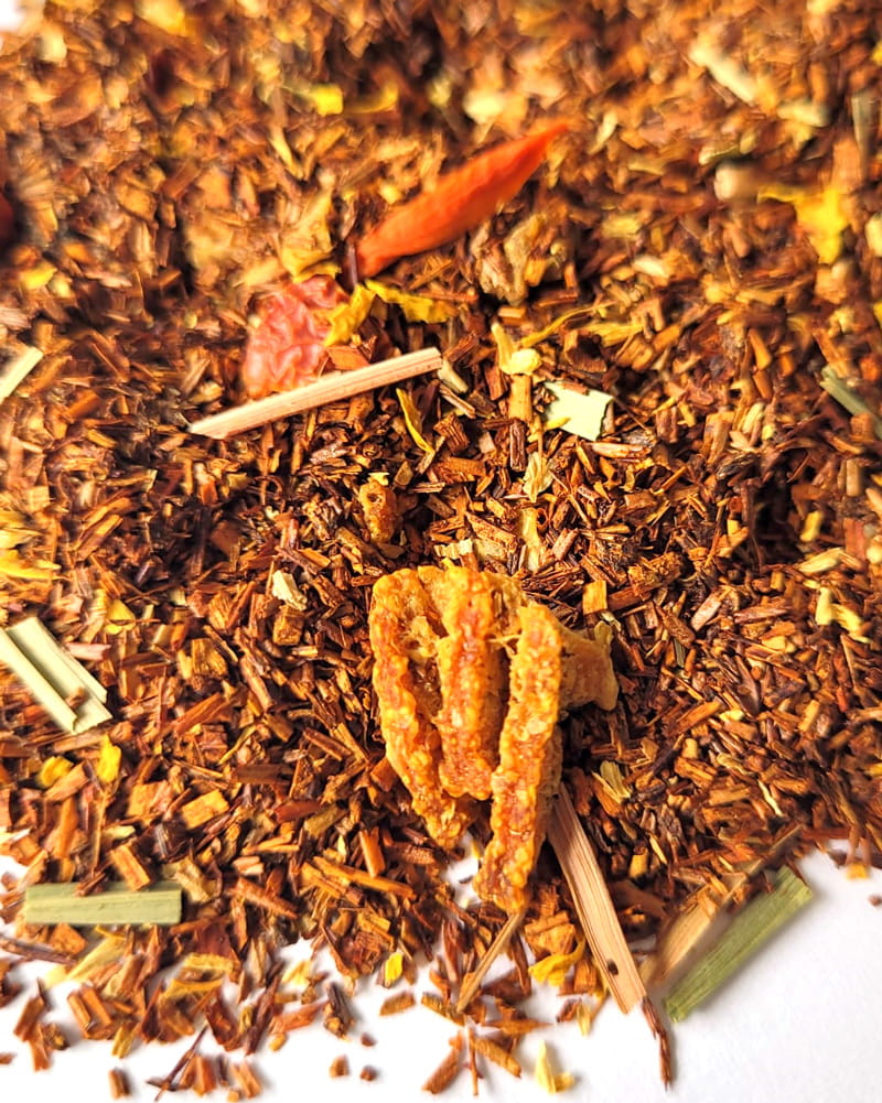 Napój bezteinowy z liści afrykańskiego czerwonokrzewu z dodatkiem aromatycznych owoców. Połączenie suszonej moreli, skórki pomarańczowej, marchwi, dzikiej róży, trawy cytrynowej oraz kwiatu słonecznika daje idealną kompozycje smaków. Napar ten uzyskuje słodki, kwiatowo - cytrusowy smak i przyjemny aromat. Perfekcyjna kompozycja a dzięki braku teiny można pić ją przez cały dzień.