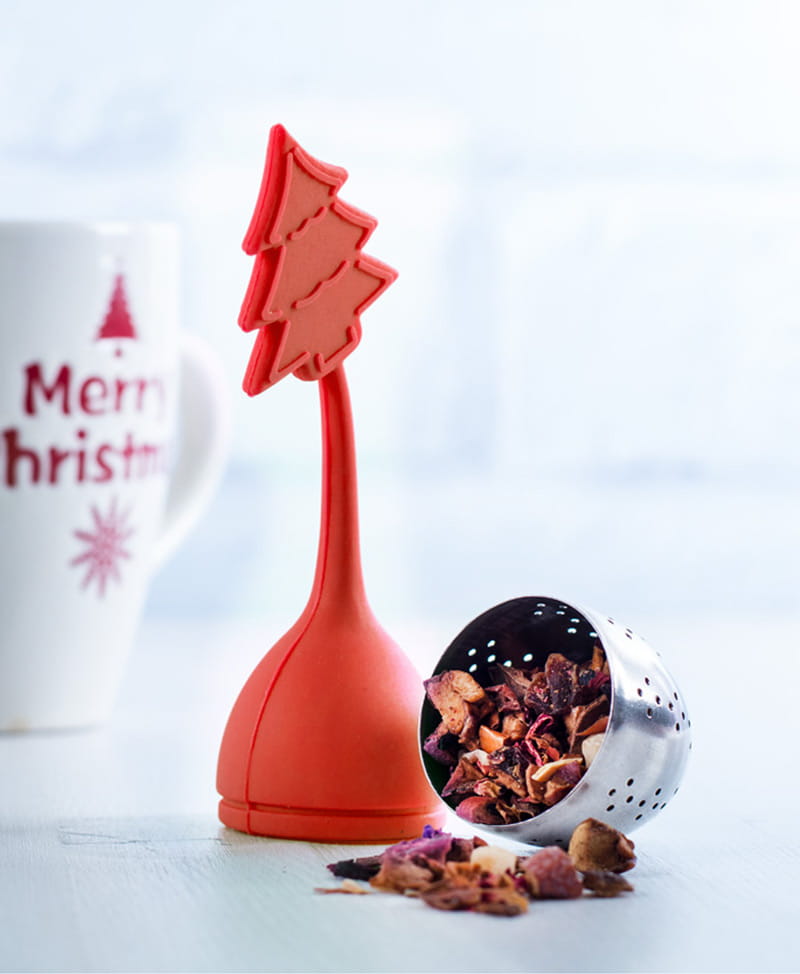 Wielokrotnego użytku zaparzacz do herbaty. Wykonany ze stali nierdzewnej i silikonu. Ma efektowny świąteczny wygląd. Silikonowa ściągana nasada ułatwia czyszczenie po zaparzeniu.